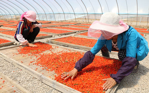 [图]农户在古浪县民权镇枸杞示范园晾晒